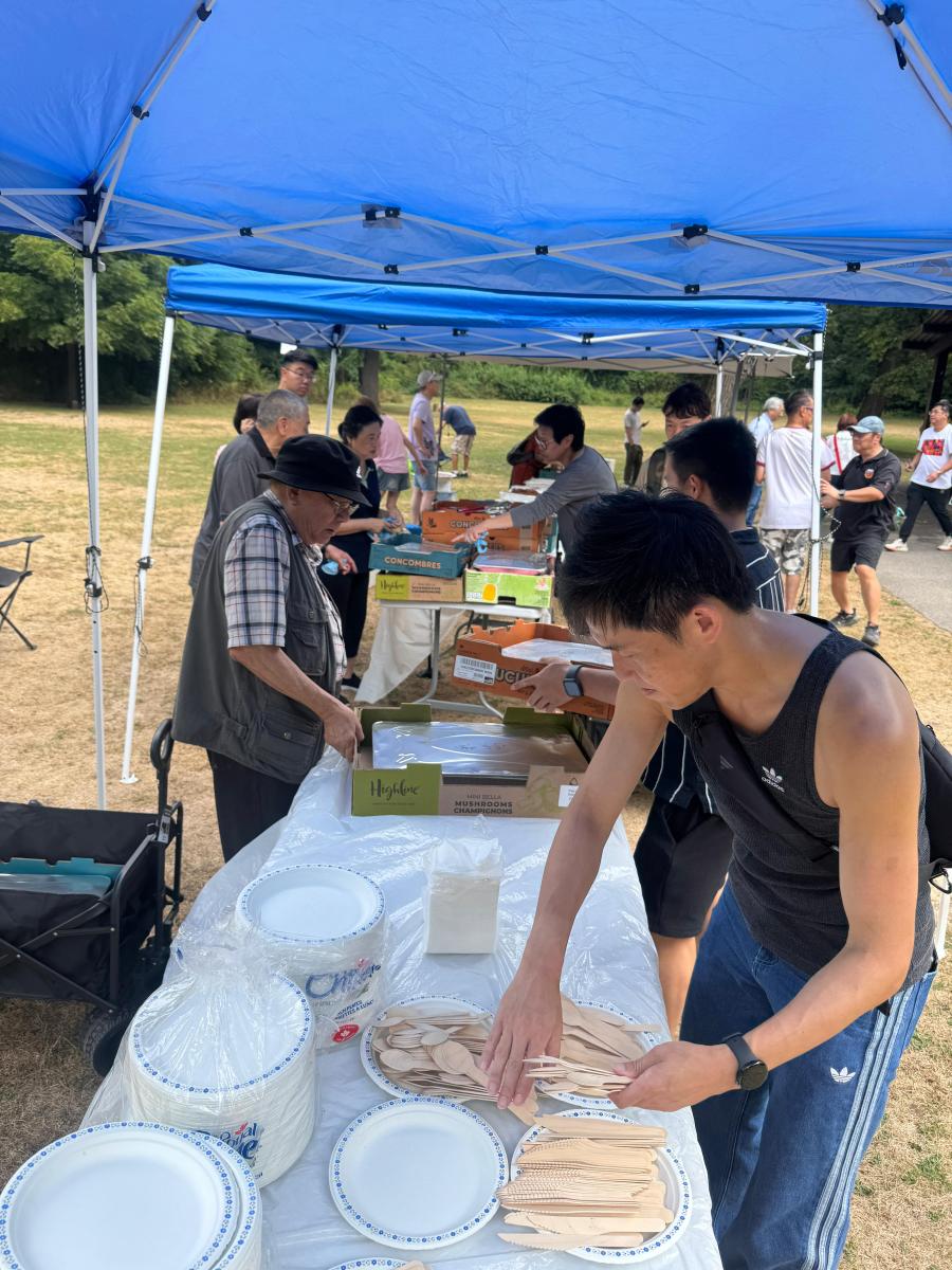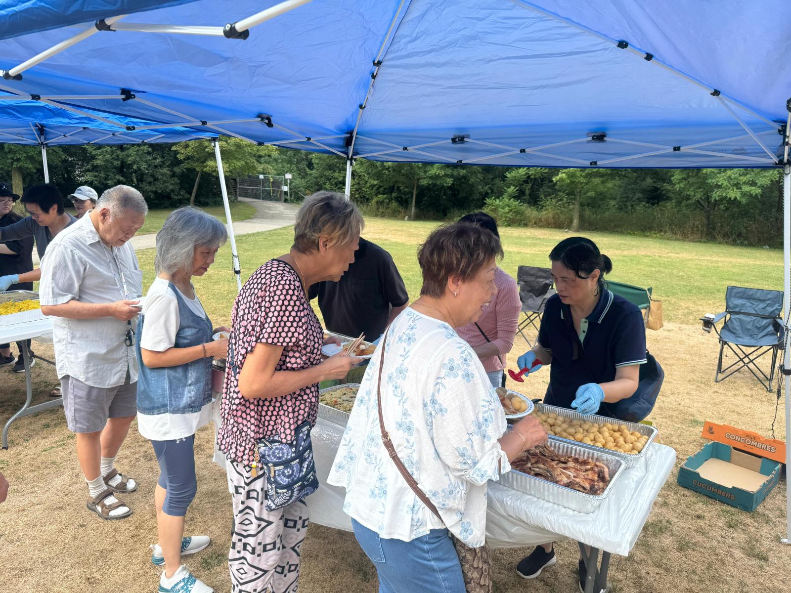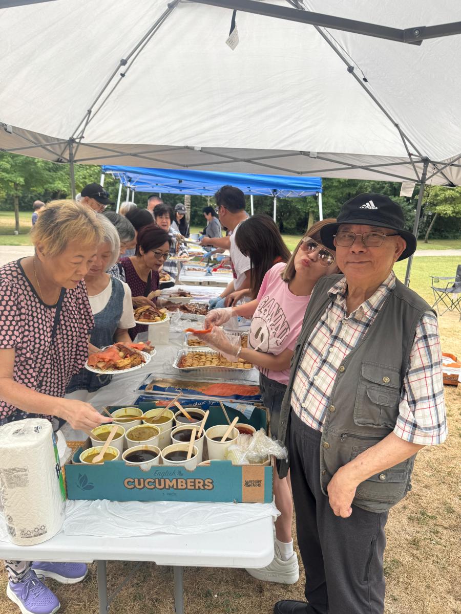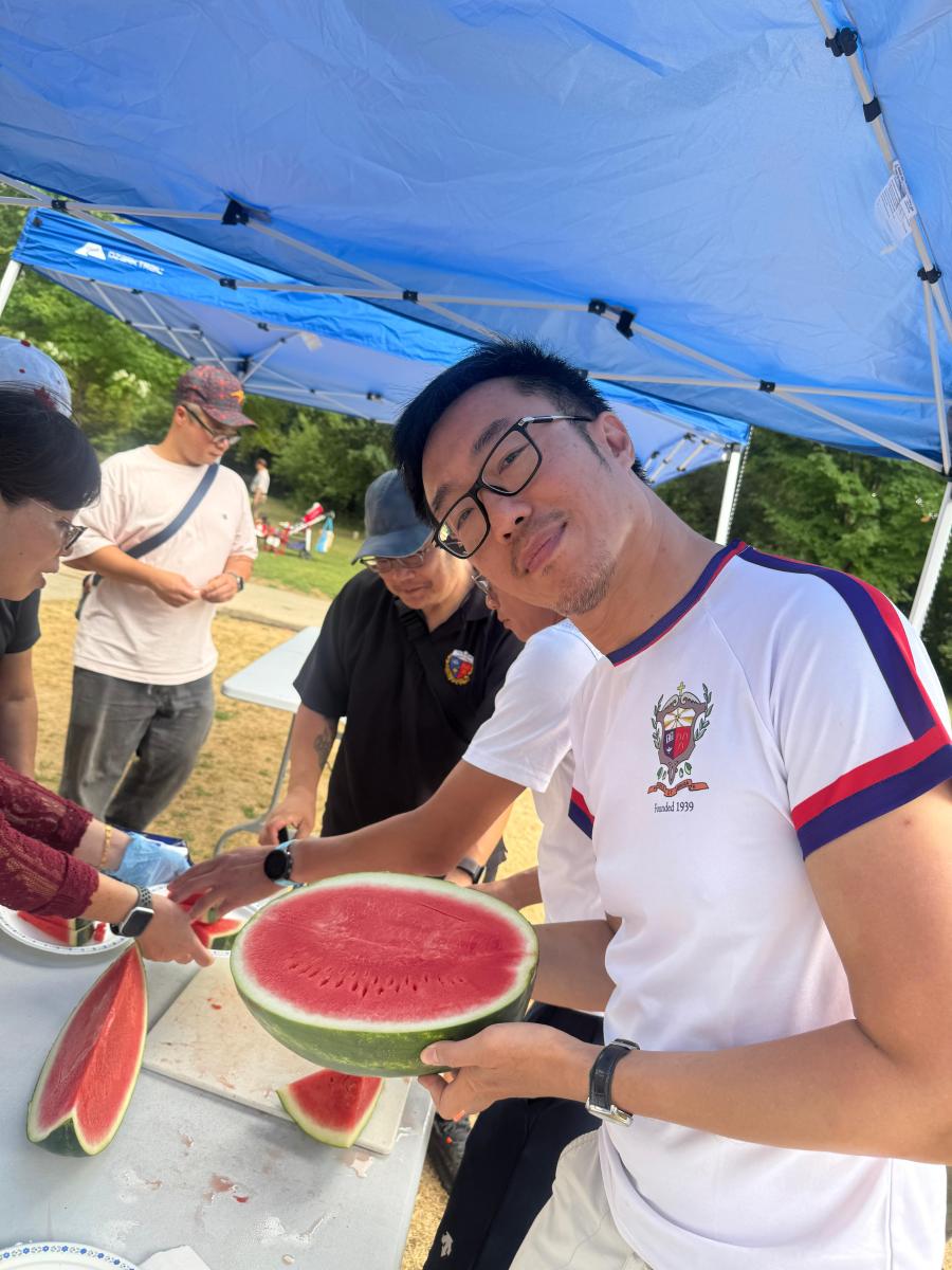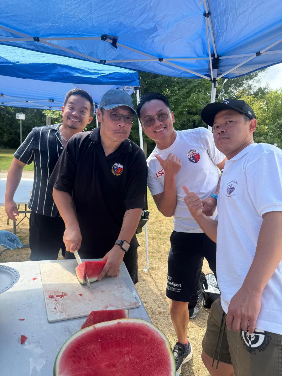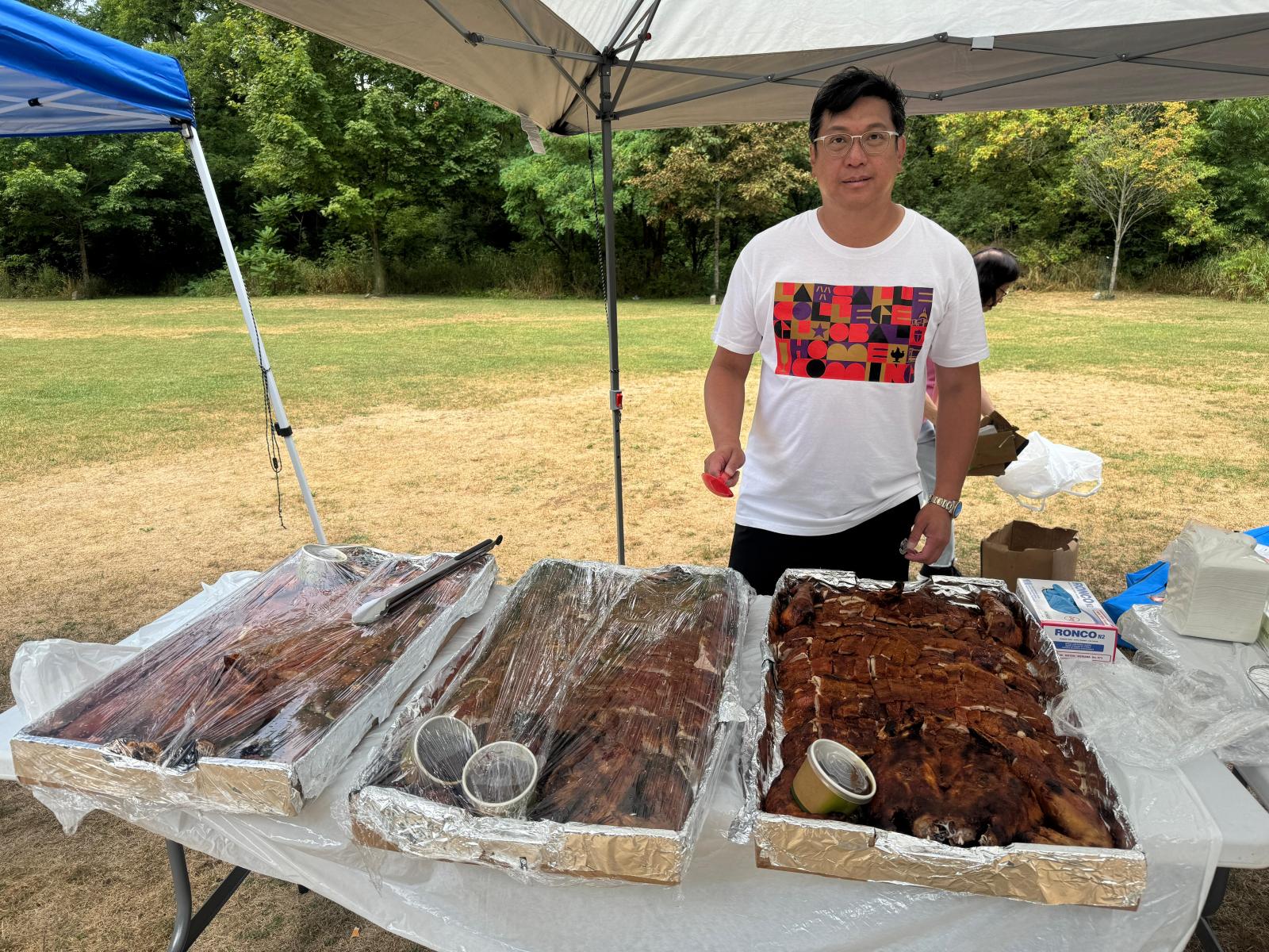 The picnic grounds were adorned with a prominent school banner, creating a familiar and proud backdrop for the day. Guests were treated to a generous and delicious spread of food and drinks. The culinary highlights were a significant success, with three whole roast pigs proving to be exceptionally popular; they were consumed entirely within the first 90 minutes of the event. By the end of the day, no food was left, a testament to the excellent planning and the enthusiastic appetites of the attendees. The feast was greatly enhanced by kind donations from several alumni. The association extends its sincere gratitude to Danny Au Yeung (’67) for 20 packs of smoked salmon, Peter Lau (’70) for fresh watermelons, Chris Fong (’94) for providing Starbucks coffee, and Chapter President Kevin Kwok (’88) for supplying essential equipment and utensils.