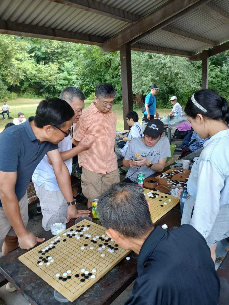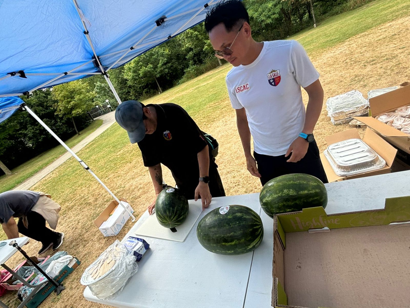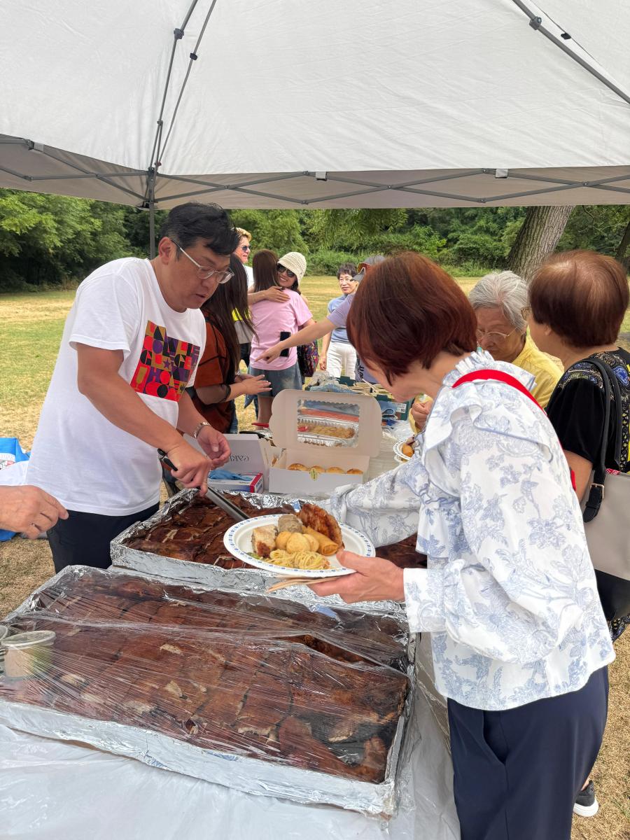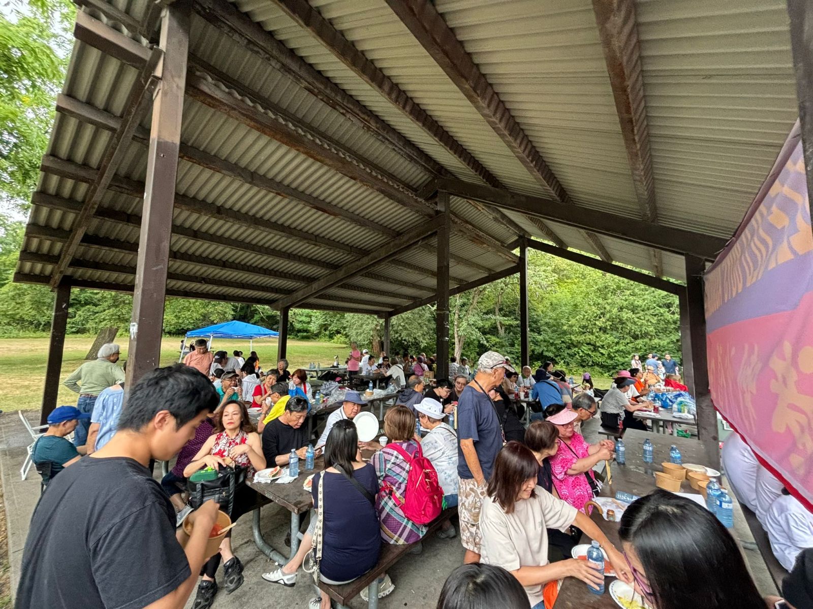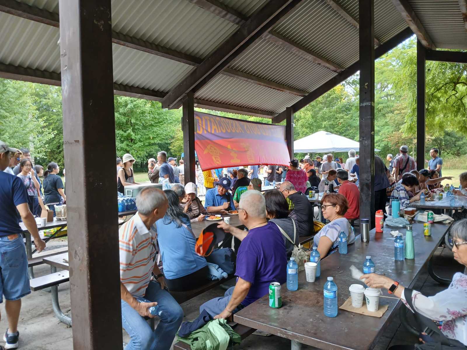 The picnic grounds were adorned with a prominent school banner, creating a familiar and proud backdrop for the day. Guests were treated to a generous and delicious spread of food and drinks. The culinary highlights were a significant success, with three whole roast pigs proving to be exceptionally popular; they were consumed entirely within the first 90 minutes of the event. By the end of the day, no food was left, a testament to the excellent planning and the enthusiastic appetites of the attendees. The feast was greatly enhanced by kind donations from several alumni. The association extends its sincere gratitude to Danny Au Yeung (’67) for 20 packs of smoked salmon, Peter Lau (’70) for fresh watermelons, Chris Fong (’94) for providing Starbucks coffee, and Chapter President Kevin Kwok (’88) for supplying essential equipment and utensils.