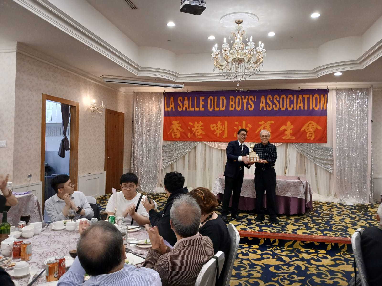 In the mid of the dinner, President Kevin Kwok presented the mahjong trophy to Greg Chen (1962). Greg won the overall champion at the annual Louis Pomeroy Memorial Trophy Mahjong Tournament held in March 2024. The annual event was held in memory of Louis Pomeroy (1941), who served on the HKLSCOBA Committee before emigrating to Canada. He was a serving director of the Toronto Chapter before he passed away in early 2011.